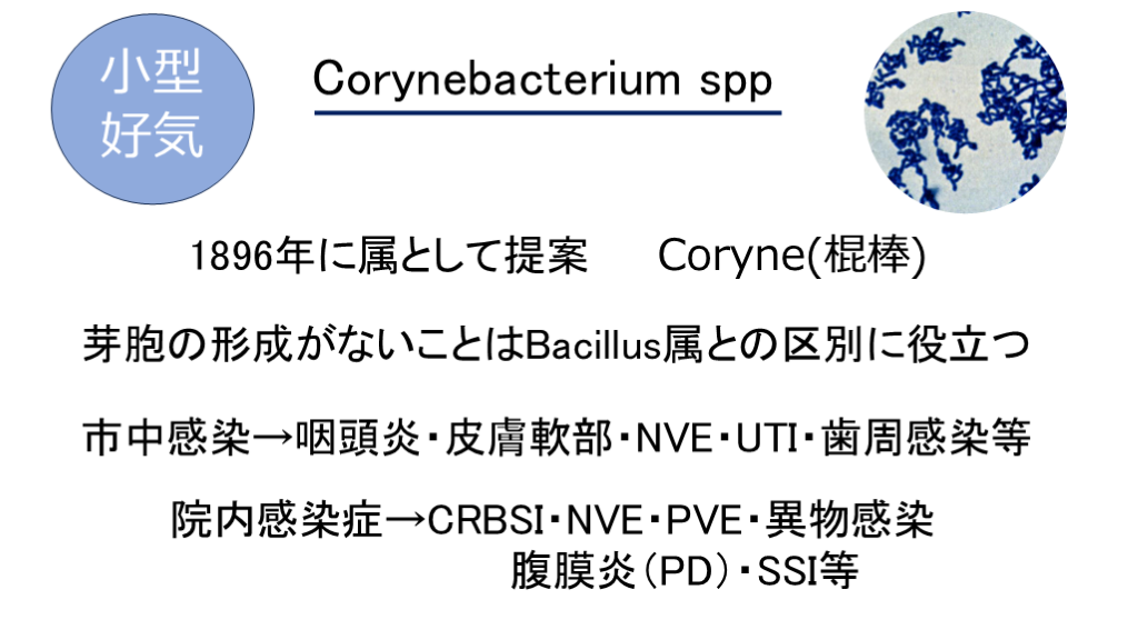 腹膜炎(PD)・SSI等 Coryne(棍棒) 小型 好気 芽胞の形成がないことはBacillus属との区別に役立つ 市中感染→咽頭炎・皮膚軟部・NVE・UTI・歯周感染等