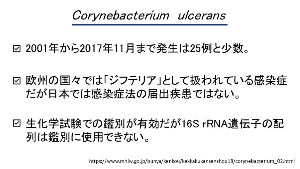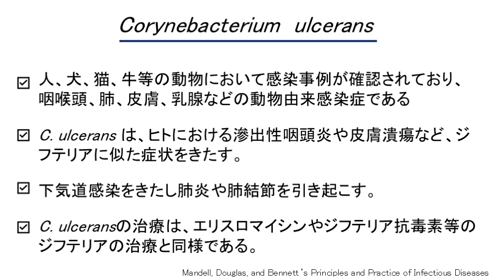#26. Corynebacterium ulcerans 人、犬、猫、牛等の動物において感染事例が確認されており、咽喉頭、肺、皮膚、乳腺などの動物由来感染症である C. ulcerans は、ヒトにおける滲出性咽頭炎や皮膚潰瘍など、ジフテリアに似た症状をきたす。 C. ulceransの治療は、エリスロマイシンやジフテリア抗毒素等のジフテリアの治療と同様である。 下気道感染をきたし肺炎や肺結節を引き起こす。 Mandell, Douglas, and Bennett‘s Principles and Practice of Infectious Diseases