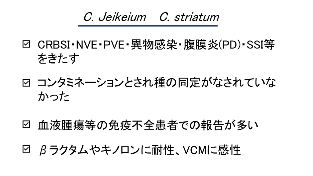 #28. C. Jeikeium C. striatum CRBSI・NVE・PVE・異物感染・腹膜炎(PD)・SSI等をきたす コンタミネーションとされ種の同定がなされていなかった 血液腫瘍等の免疫不全患者での報告が多い βラクタムやキノロンに耐性、VCMに感性