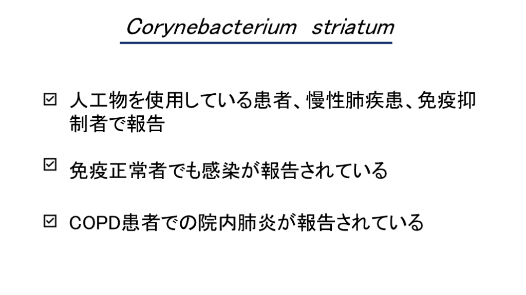 #29. 人工物を使用している患者、慢性肺疾患、免疫抑制者で報告 免疫正常者でも感染が報告されている COPD患者での院内肺炎が報告されている Corynebacterium striatum