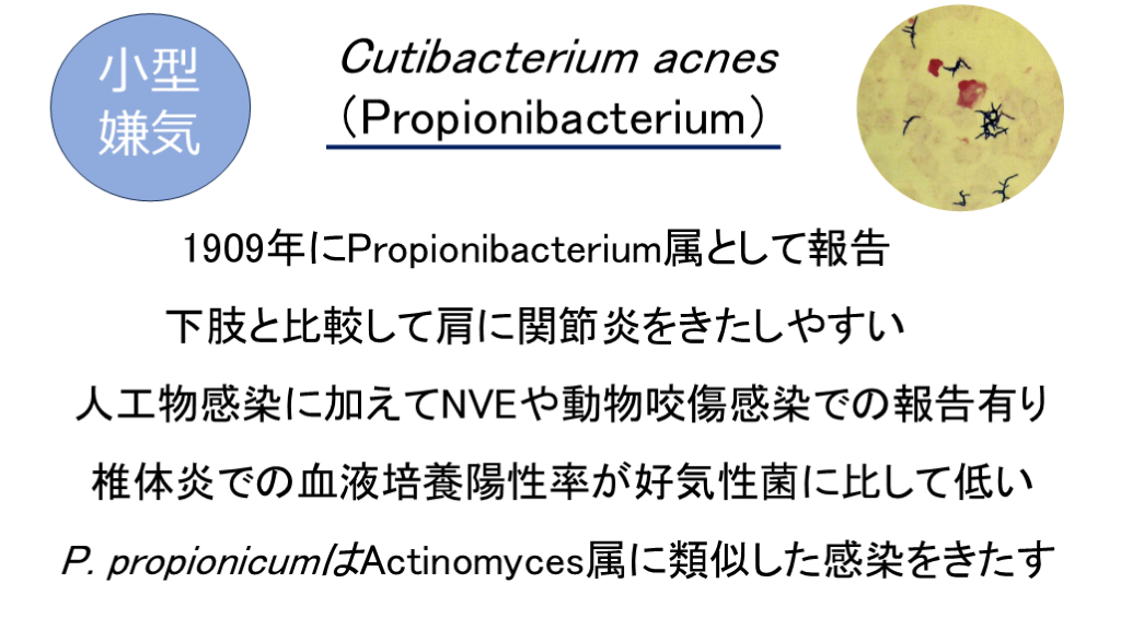 #30. Cutibacterium acnes 小型 嫌気 1909年にPropionibacterium属として報告 (Propionibacterium) 下肢と比較して肩に関節炎をきたしやすい 人工物感染に加えてNVEや動物咬傷感染での報告有り 椎体炎での血液培養陽性率が好気性菌に比して低い P. propionicumはActinomyces属に類似した感染をきたす