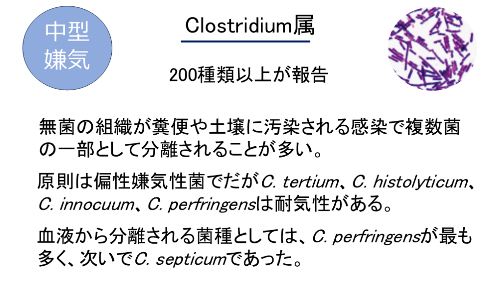 の一部として分離されることが多い。 原則は偏性嫌気性菌でだがC. tertium、C. histolyticum、C. innocuum、C. perfringensは耐気性がある。 血液から分離される菌種としては、C. perfringensが最も多く、次いでC. septicumであった。
