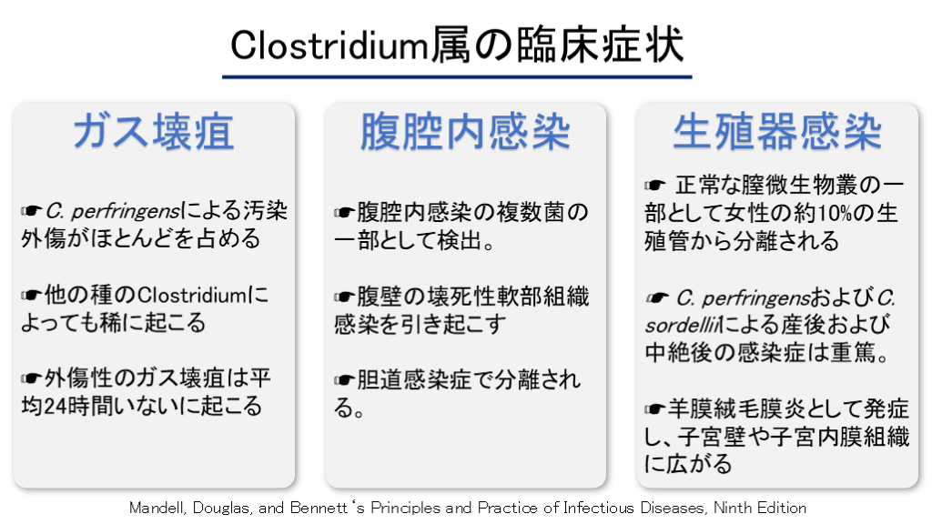 ☛羊膜絨毛膜炎として発症し、子宮壁や子宮内膜組織に広がる Clostridium属の臨床症状 Mandell, Douglas, and Bennett‘s Principles and Practice of Infectious Diseases, Ninth Edition
