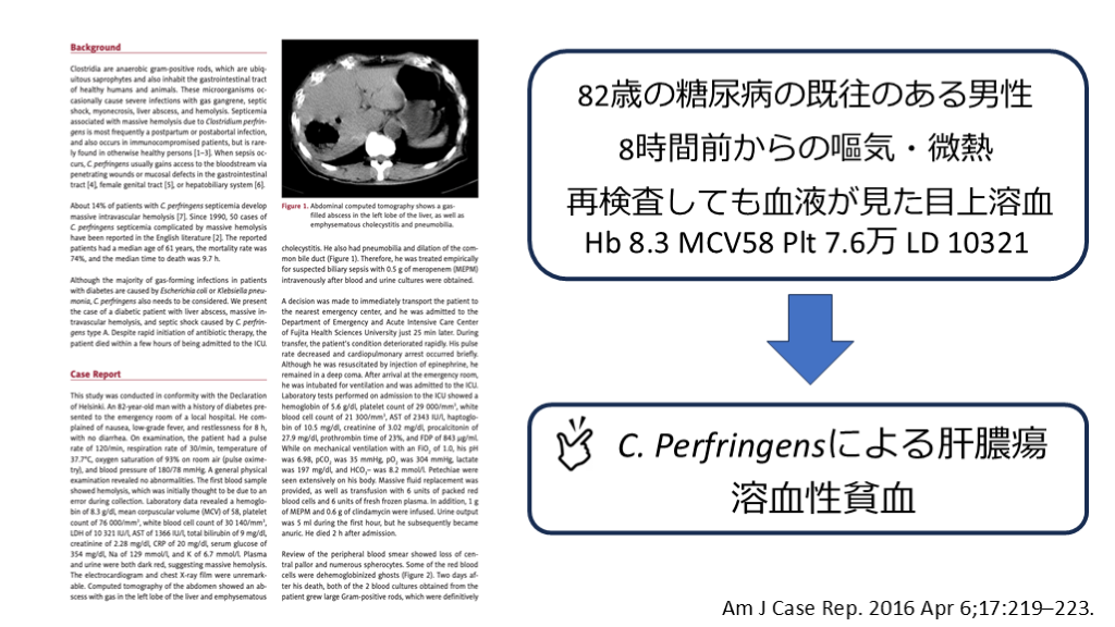 Hb 8.3 MCV58 Plt 7.6万 LD 10321 C. Perfringensによる肝膿瘍 溶血性貧血