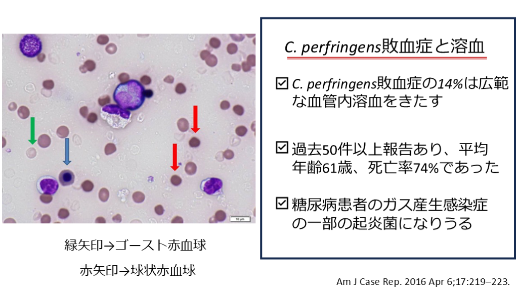 #36. 緑矢印→ゴースト赤血球 Am J Case Rep. 2016 Apr 6;17:219–223. 赤矢印→球状赤血球 C. perfringens敗血症の14%は広範な血管内溶血をきたす 過去50件以上報告あり、平均年齢61歳、死亡率74%であった 糖尿病患者のガス産生感染症の一部の起炎菌になりうる C. perfringens敗血症と溶血