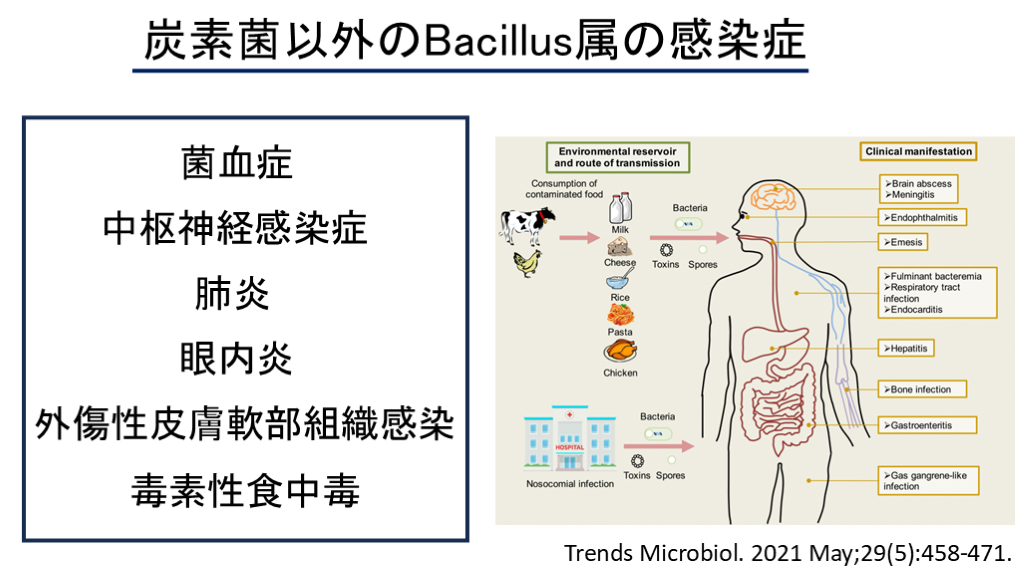 #39. 炭素菌以外のBacillus属の感染症 菌血症 中枢神経感染症 毒素性食中毒 肺炎 眼内炎 外傷性皮膚軟部組織感染 Trends Microbiol. 2021 May;29(5):458-471.