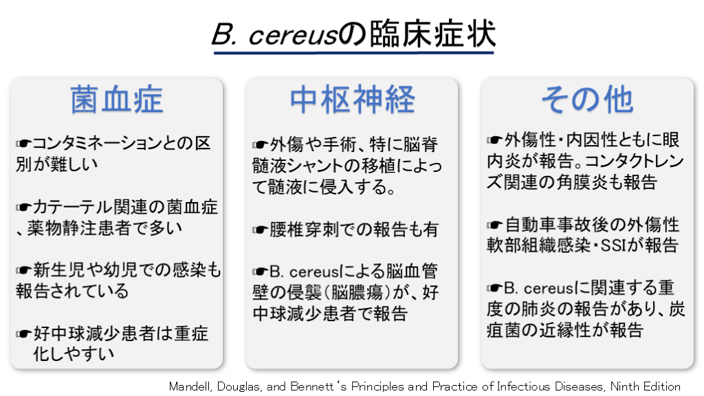 B. cereusの臨床症状 Mandell, Douglas, and Bennett‘s Principles and Practice of Infectious Diseases, Ninth Edition