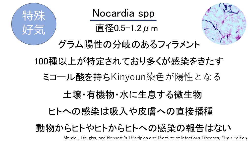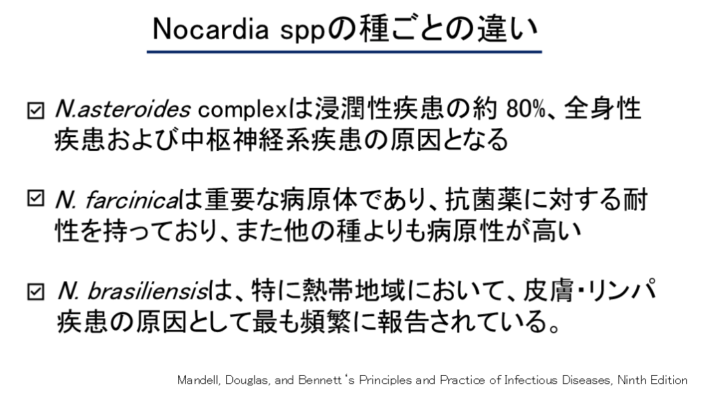 #44. Nocardia sppの種ごとの違い N.asteroides complexは浸潤性疾患の約 80%、全身性疾患および中枢神経系疾患の原因となる N. farcinicaは重要な病原体であり、抗菌薬に対する耐性を持っており、また他の種よりも病原性が高い N. brasiliensisは、特に熱帯地域において、皮膚・リンパ疾患の原因として最も頻繁に報告されている。 Mandell, Douglas, and Bennett‘s Principles and Practice of Infectious Diseases, Ninth Edition