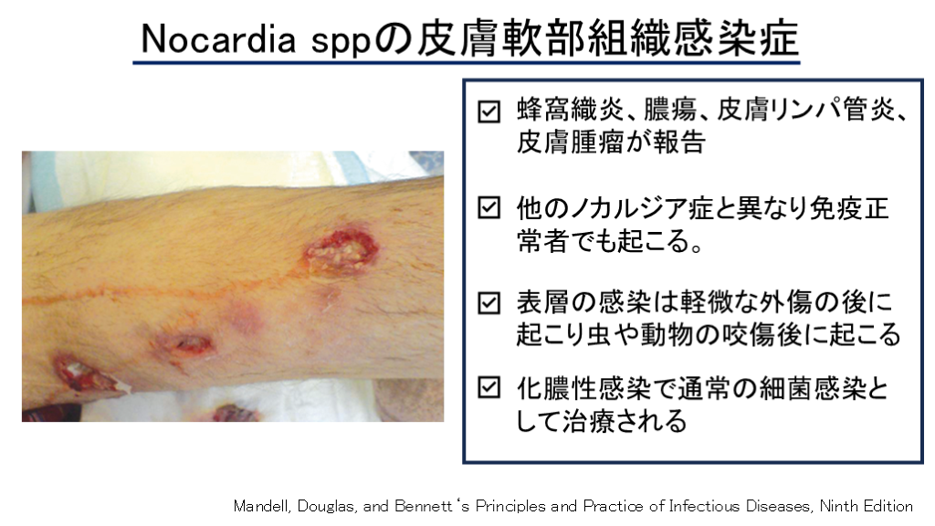 #48. Nocardia sppの皮膚軟部組織感染症 蜂窩織炎、膿瘍、皮膚リンパ管炎、皮膚腫瘤が報告 他のノカルジア症と異なり免疫正常者でも起こる。 表層の感染は軽微な外傷の後に