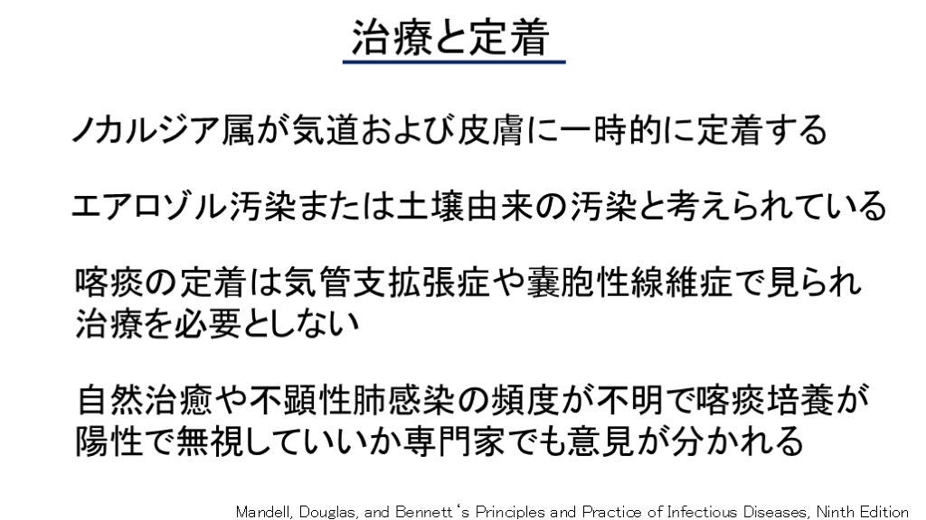 #49. 治療と定着 ノカルジア属が気道および皮膚に一時的に定着する エアロゾル汚染または土壌由来の汚染と考えられている 喀痰の定着は気管支拡張症や嚢胞性線維症で見られ治療を必要としない 自然治癒や不顕性肺感染の頻度が不明で喀痰培養が陽性で無視していいか専門家でも意見が分かれる Mandell, Douglas, and Bennett‘s Principles and Practice of Infectious Diseases, Ninth Edition