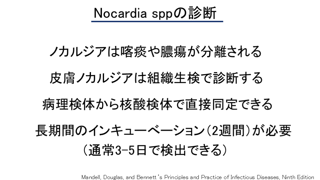 #50. Nocardia sppの診断 ノカルジアは喀痰や膿瘍が分離される 皮膚ノカルジアは組織生検で診断する 病理検体から核酸検体で直接同定できる 長期間のインキューべーション(2週間)が必要 Mandell, Douglas, and Bennett‘s Principles and Practice of Infectious Diseases, Ninth Edition (通常3-5日で検出できる)