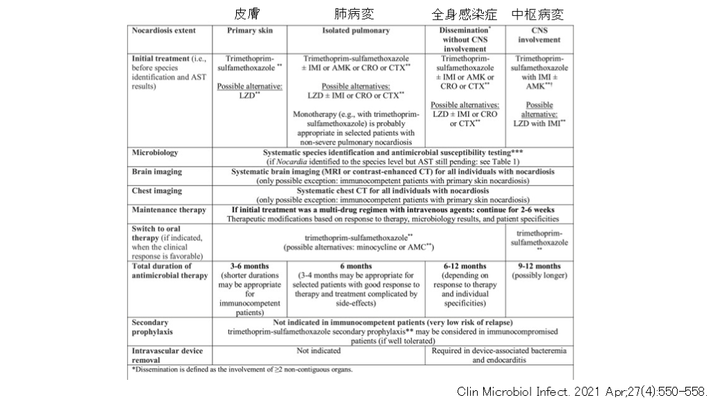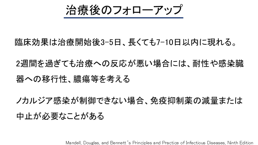 #55. 臨床効果は治療開始後3-5日、長くても7-10日以内に現れる。 Mandell, Douglas, and Bennett‘s Principles and Practice of Infectious Diseases, Ninth Edition 2週間を過ぎても治療への反応が悪い場合には、耐性や感染臓器への移行性、膿瘍等を考える ノカルジア感染が制御できない場合、免疫抑制薬の減量または中止が必要なことがある