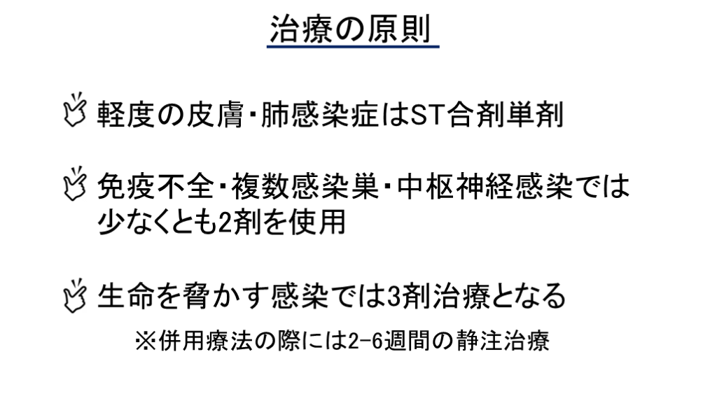 作用や副作用に基づいて行う 中枢神経や播種性感染ではST合剤に加えて
