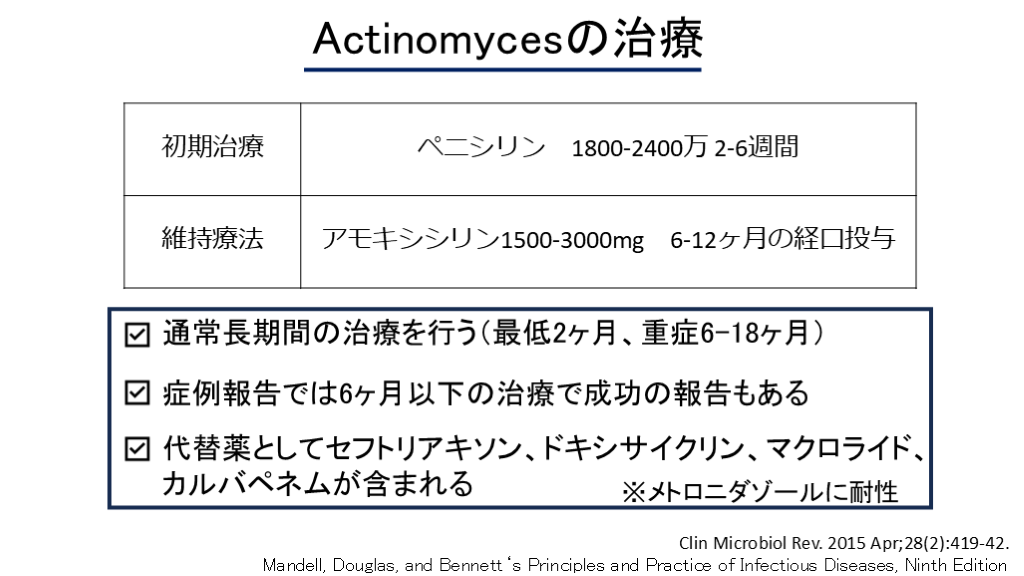 #61. Clin Microbiol Rev. 2015 Apr;28(2):419-42. Mandell, Douglas, and Bennett‘s Principles and Practice of Infectious Diseases, Ninth Edition Actinomycesの治療 通常長期間の治療を行う(最低2ヶ月、重症6-18ヶ月) 症例報告では6ヶ月以下の治療で成功の報告もある 代替薬としてセフトリアキソン、ドキシサイクリン、マクロライド、カルバペネムが含まれる ※メトロニダゾールに耐性