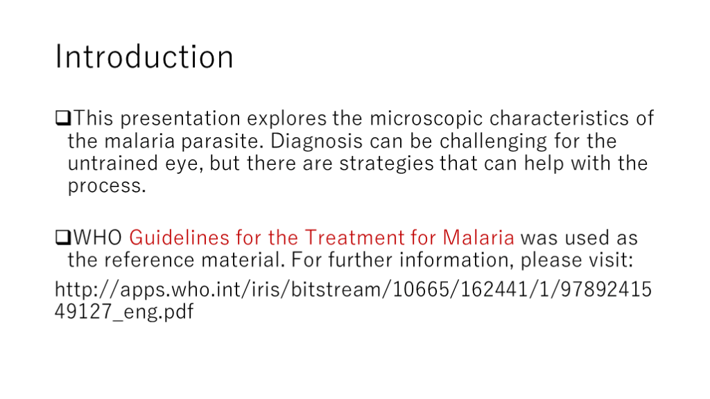 Introduction This presentation explores the microscopic characteristics of the malaria parasite. Diagnosis can be challenging for the untrained eye, but there are strategies that can help with the process.