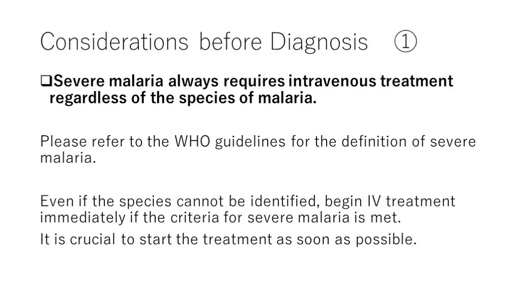 Considerations before Diagnosis ① Severe malaria always requires intravenous treatment regardless of the species of malaria.