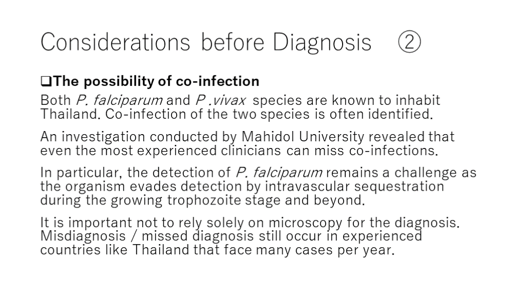 It is important not to rely solely on microscopy for the diagnosis. Misdiagnosis / missed diagnosis still occur in experienced countries like Thailand that face many cases per year.