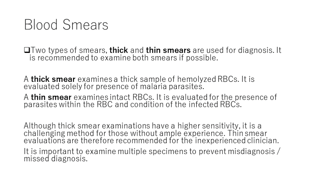 Blood Smears Two types of smears, thick and thin smears are used for diagnosis. It is recommended to examine both smears if possible.