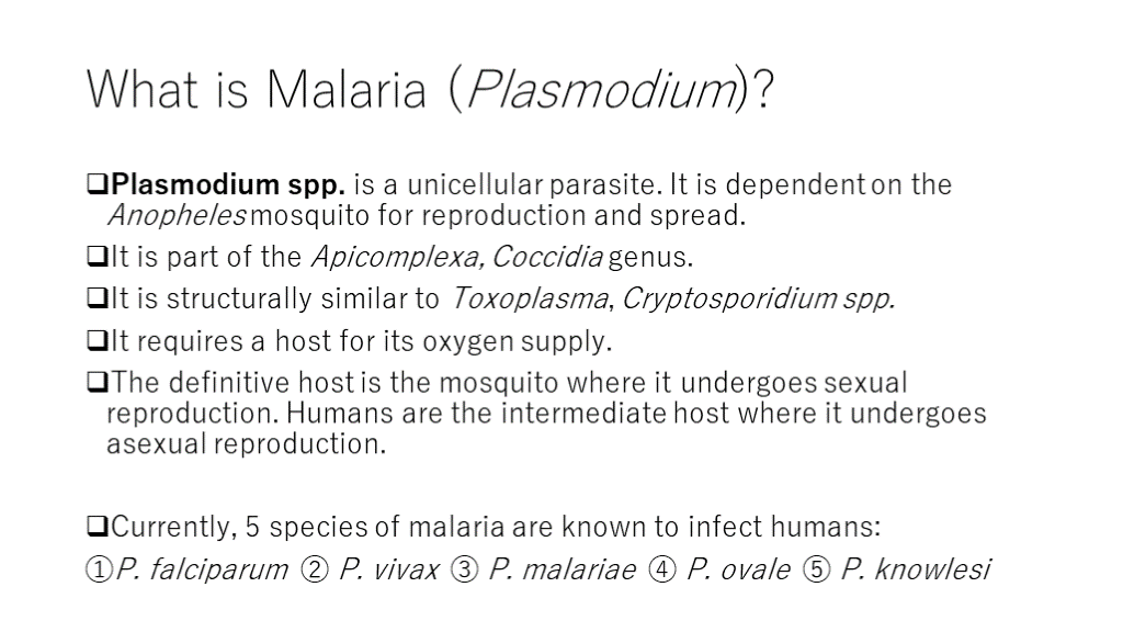 What is Malaria (Plasmodium)? Plasmodium spp. is a unicellular parasite. It is dependent on the Anopheles mosquito for reproduction and spread.