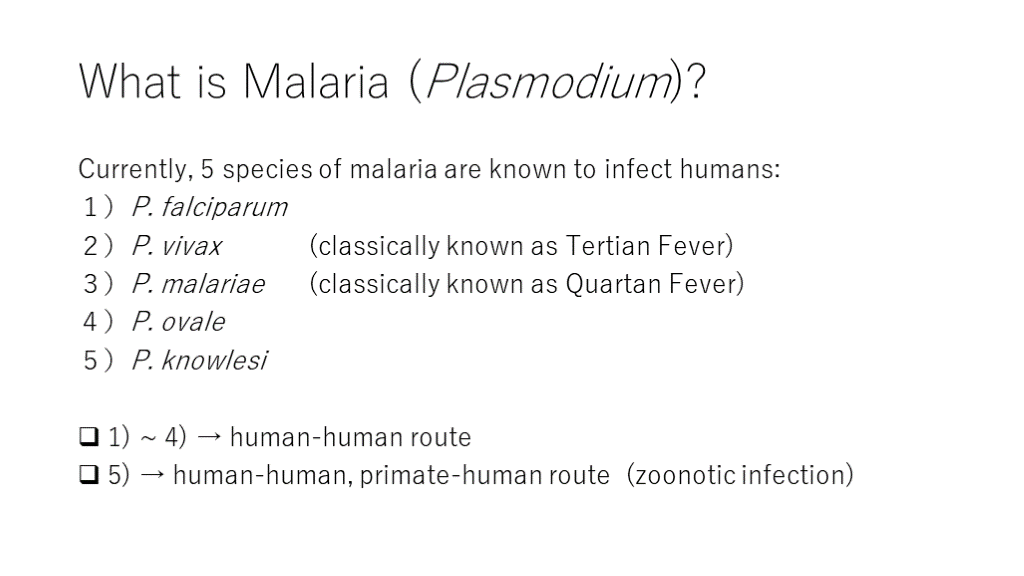 ①P. falciparum ② P. vivax ③ P. malariae ④ P. ovale ⑤ P. knowlesi
