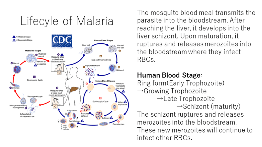 Lifecyle of Malaria The mosquito blood meal transmits the parasite into the bloodstream. After reaching the liver, it develops into the liver schizont. Upon maturation, it ruptures and releases merozoites into the bloodstream where they infect RBCs.