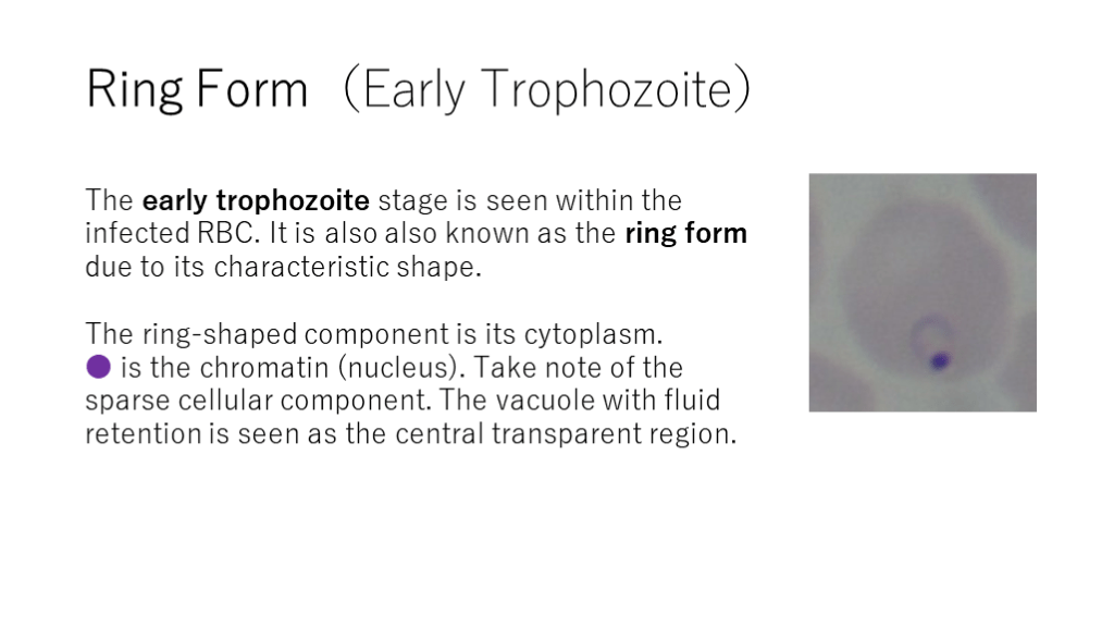 Ring Form(Early Trophozoite) The early trophozoite stage is seen within the infected RBC. It is also also known as the ring form due to its characteristic shape.