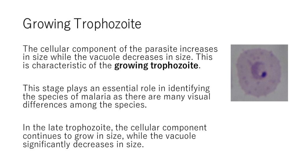 Growing Trophozoite The cellular component of the parasite increases in size while the vacuole decreases in size. This is characteristic of the growing trophozoite.