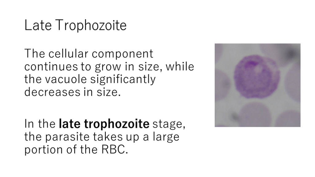 Late Trophozoite The cellular component continues to grow in size, while the vacuole significantly decreases in size.