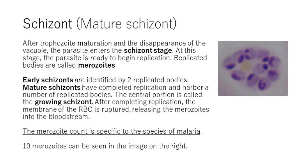 Schizont (Mature schizont) After trophozoite maturation and the disappearance of the vacuole, the parasite enters the schizont stage. At this stage, the parasite is ready to begin replication. Replicated bodies are called merozoites.