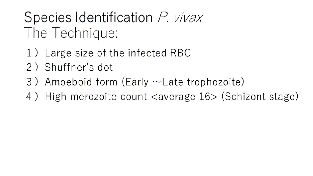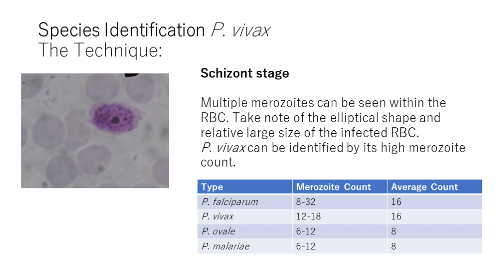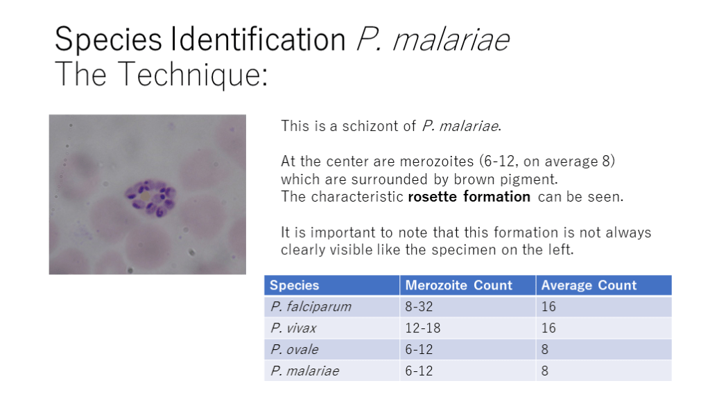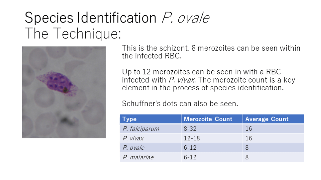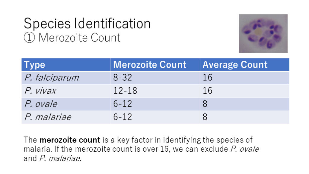 Species Identification① Merozoite Count The merozoite count is a key factor in identifying the species of malaria. If the merozoite count is over 16, we can exclude P. ovale and P. malariae.