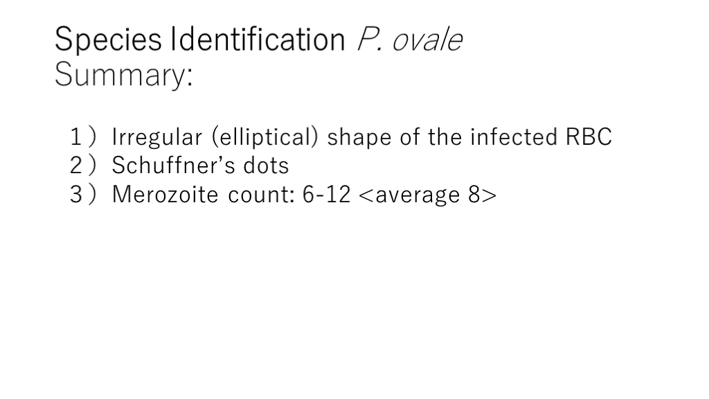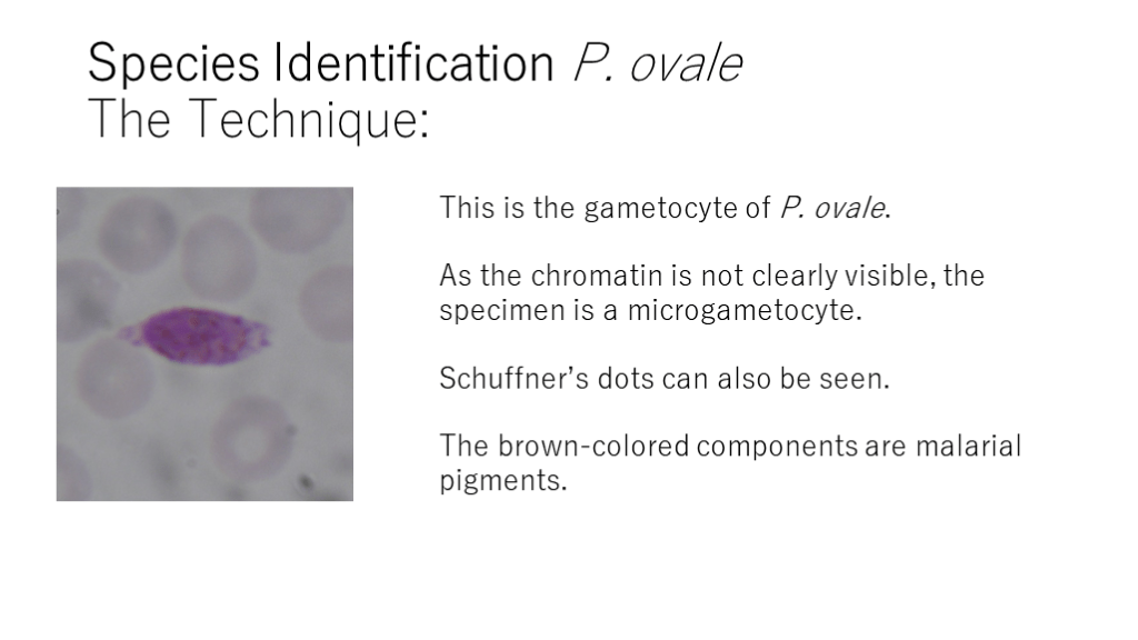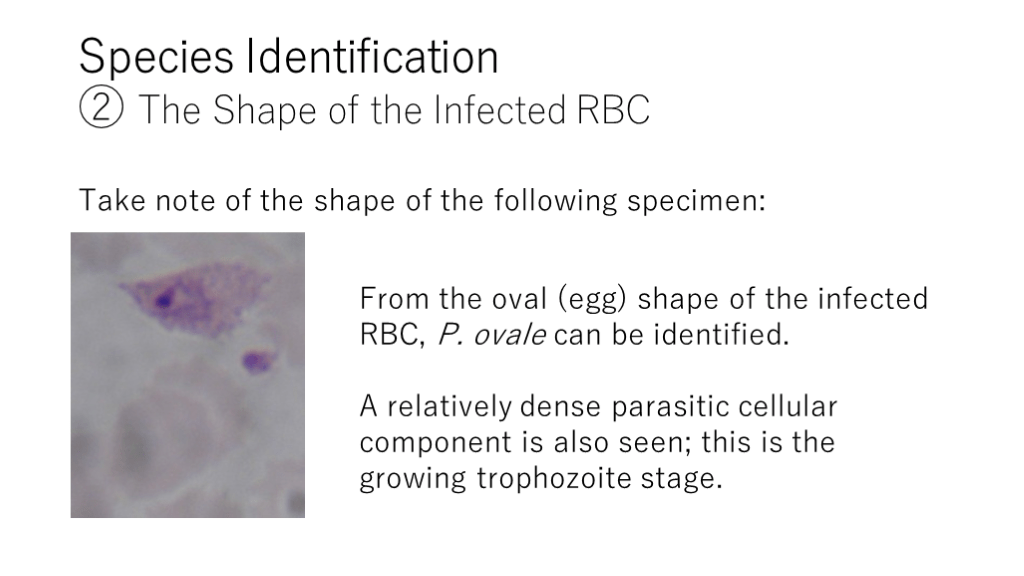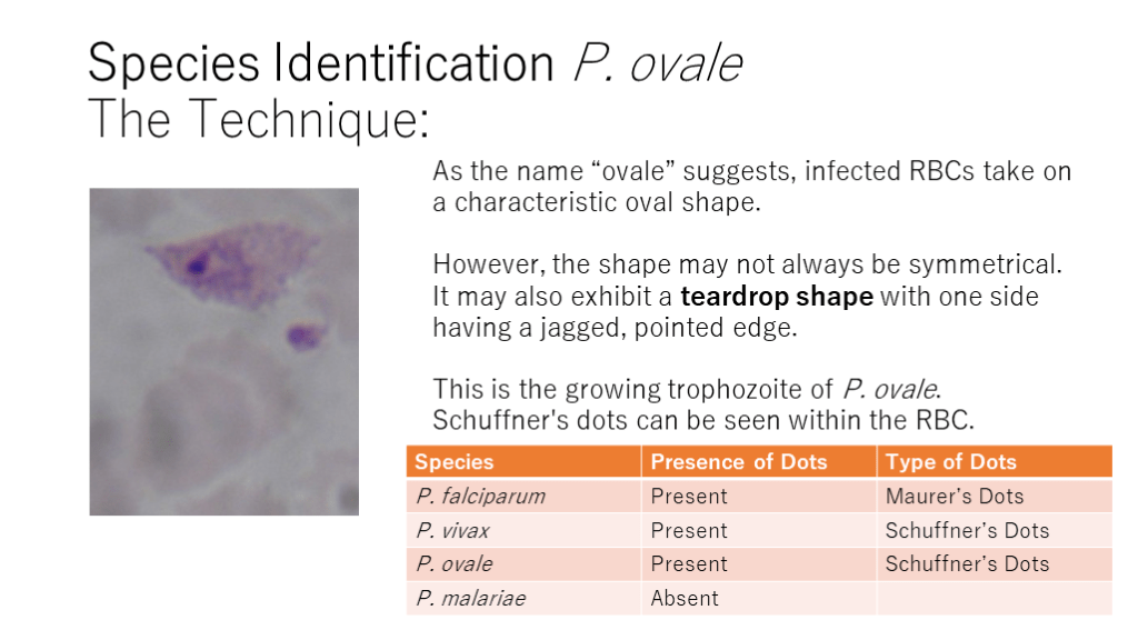 Species Identification P. ovaleThe Technique: As the name “ovale” suggests, infected RBCs take on a characteristic oval shape.