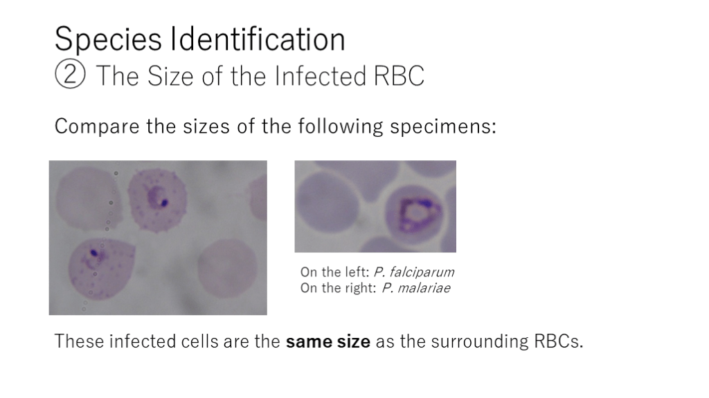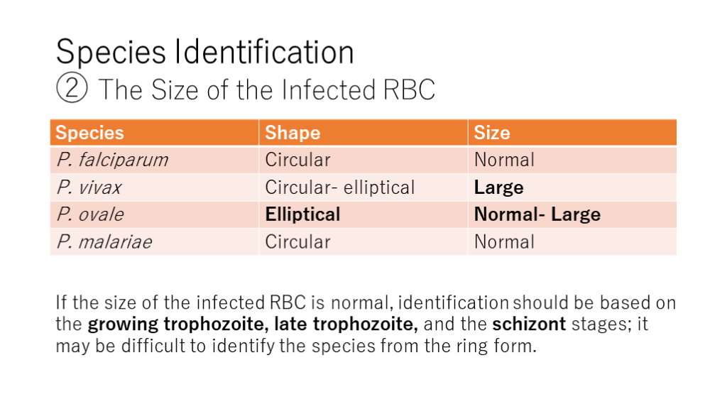 Species Identification② The Size of the Infected RBC If the size of the infected RBC is normal, identification should be based on the growing trophozoite, late trophozoite, and the schizont stages; it may be difficult to identify the species from the ring form.