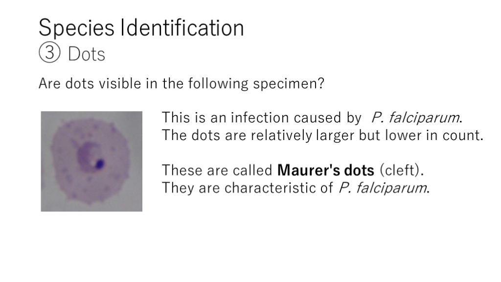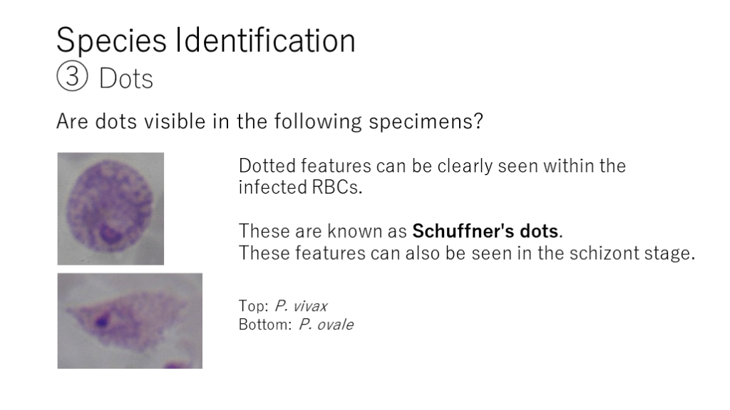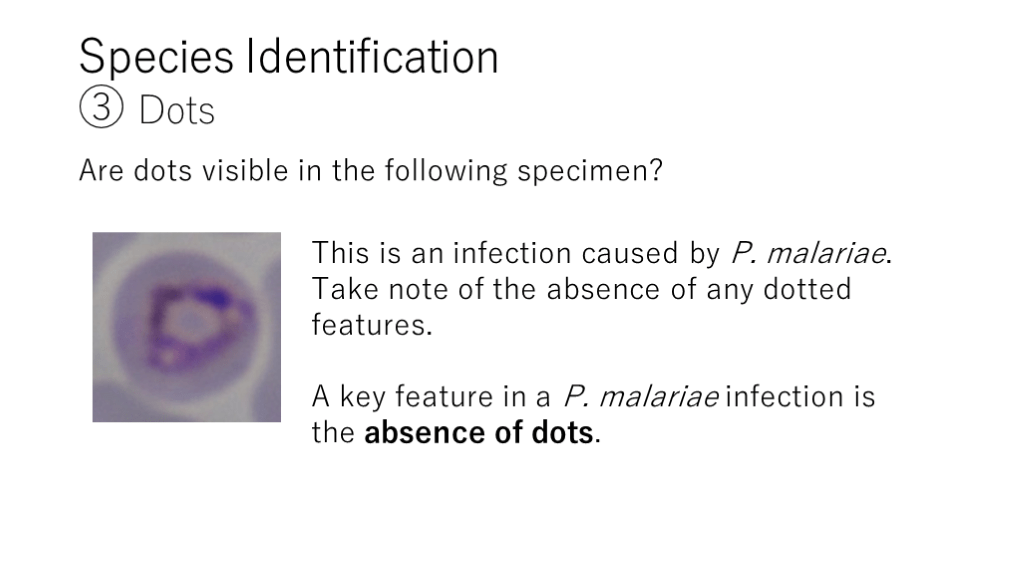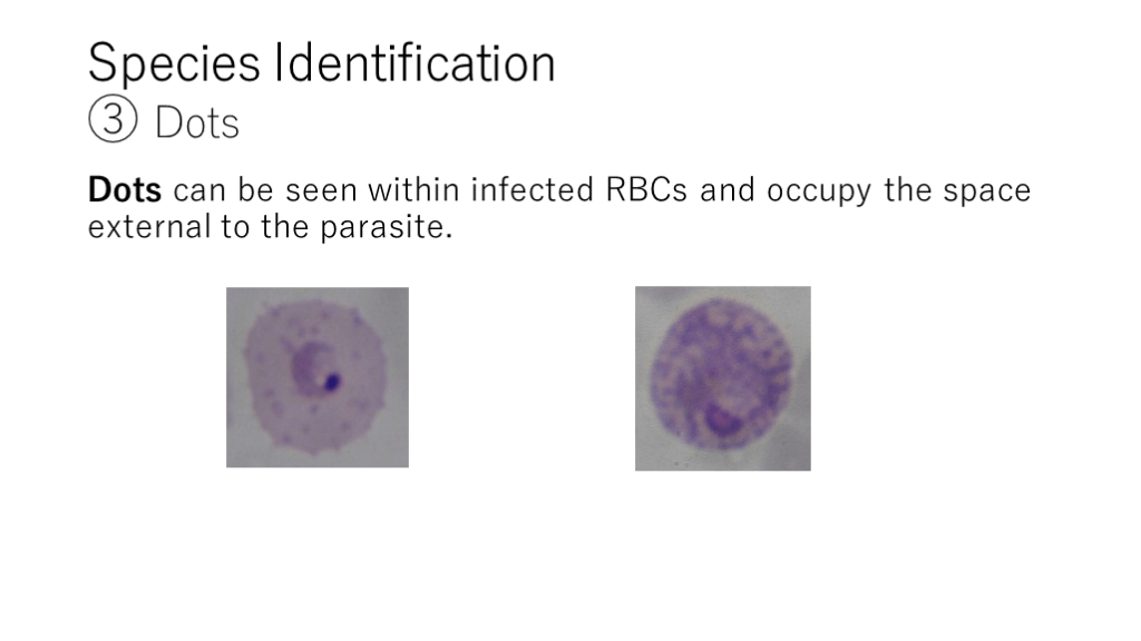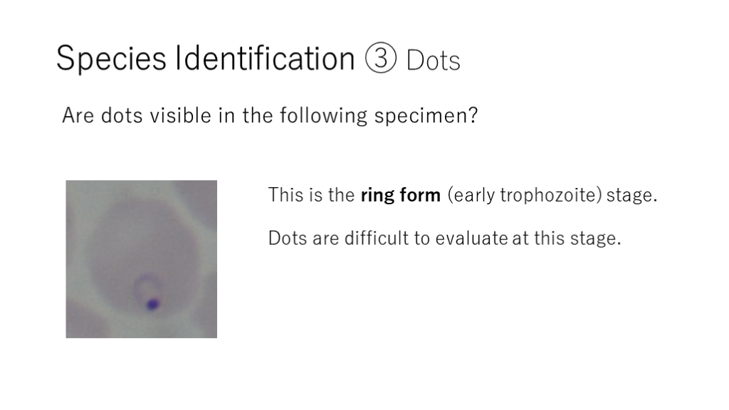 Species Identification ③ Dots Are dots visible in the following specimen? This is the ring form (early trophozoite) stage.