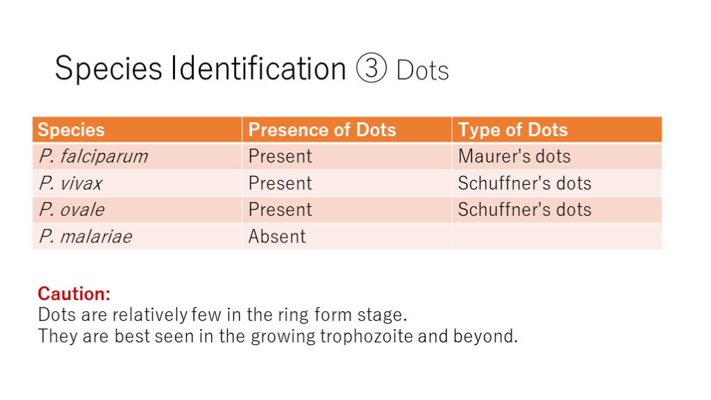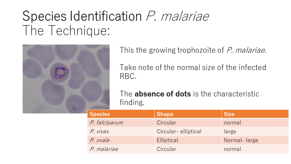 The absence of dots is the characteristic finding. Species Identification P. malariaeThe Technique: