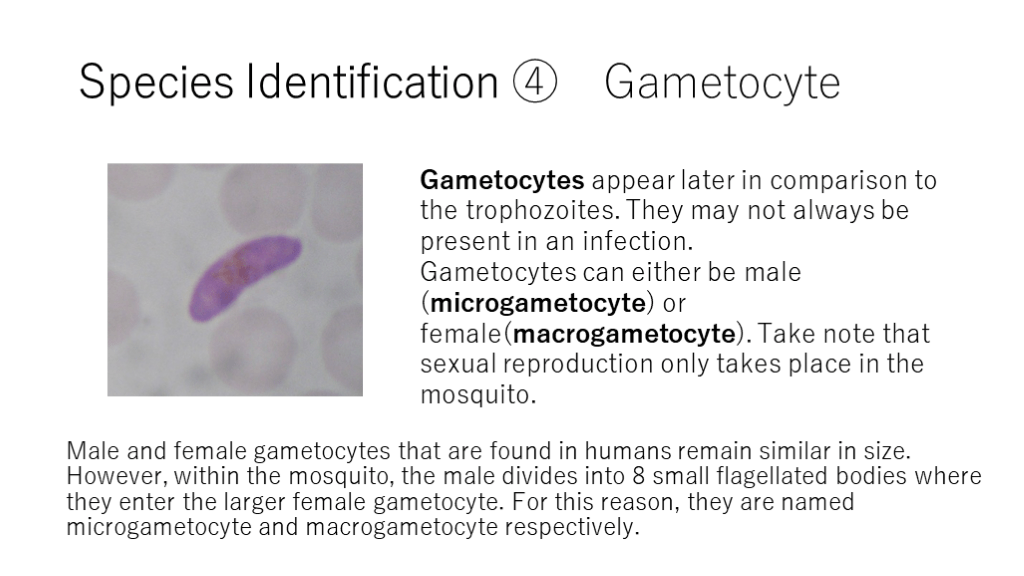 Species Identification ④ Gametocyte Gametocytes appear later in comparison to the trophozoites. They may not always be present in an infection.