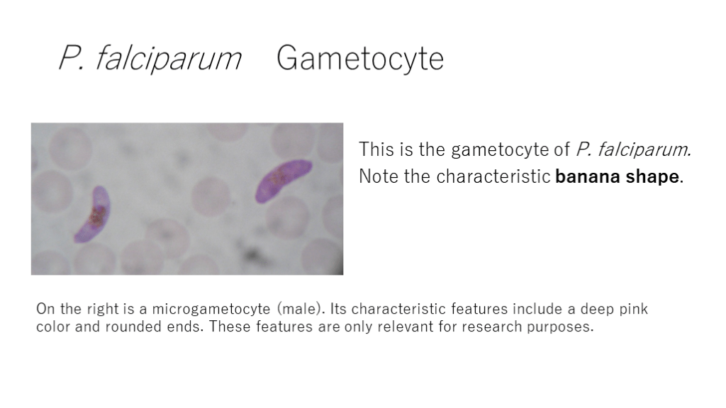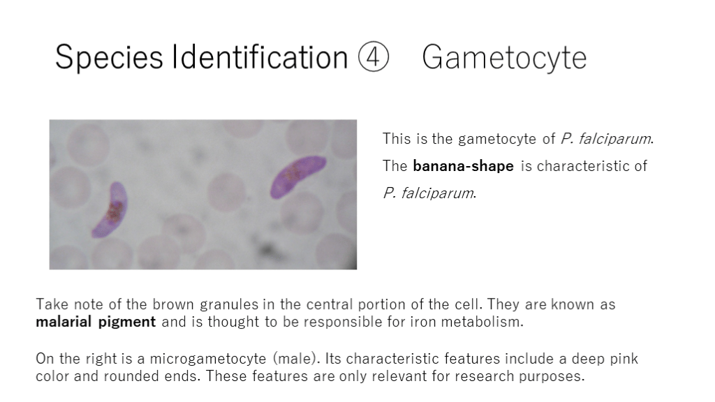 On the right is a microgametocyte (male). Its characteristic features include a deep pink color and rounded ends. These features are only relevant for research purposes. Species Identification ④ Gametocyte