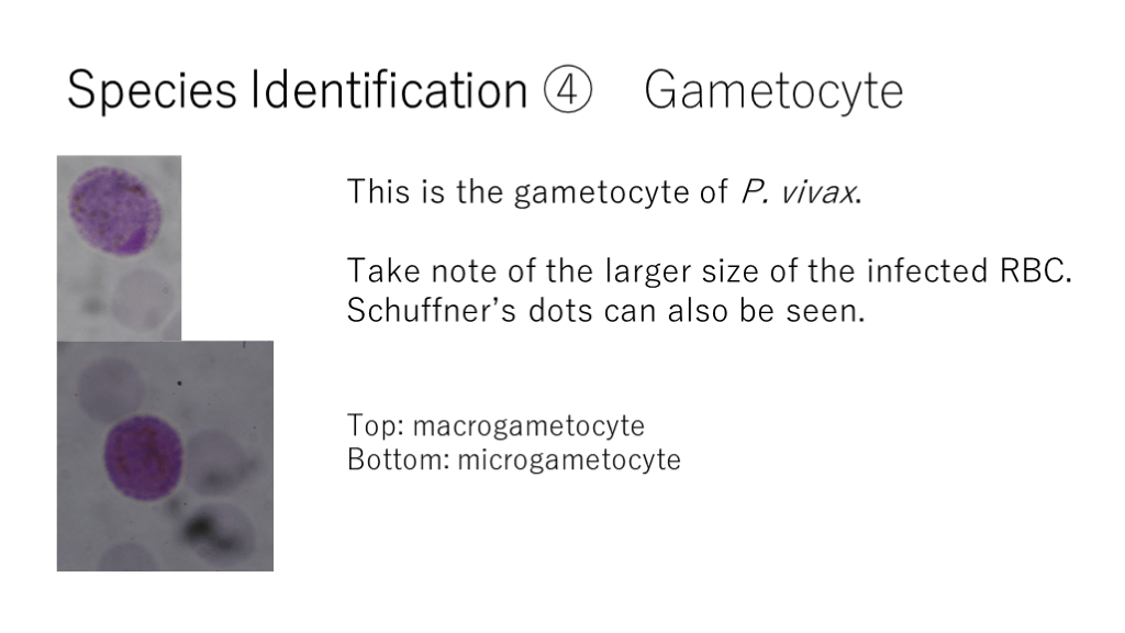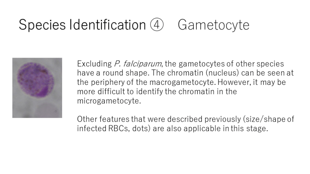 Species Identification ④ Gametocyte Excluding P. falciparum, the gametocytes of other species have a round shape. The chromatin (nucleus) can be seen at the periphery of the macrogametocyte. However, it may be more difficult to identify the chromatin in the microgametocyte.