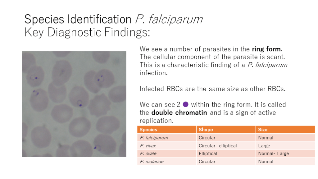 Species Identification P. falciparumKey Diagnostic Findings: We see a number of parasites in the ring form.