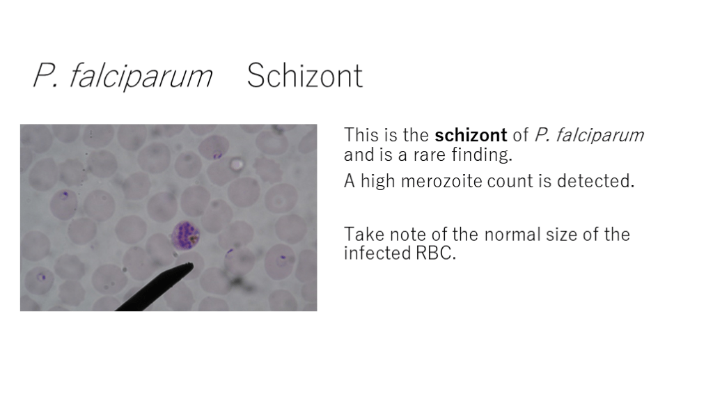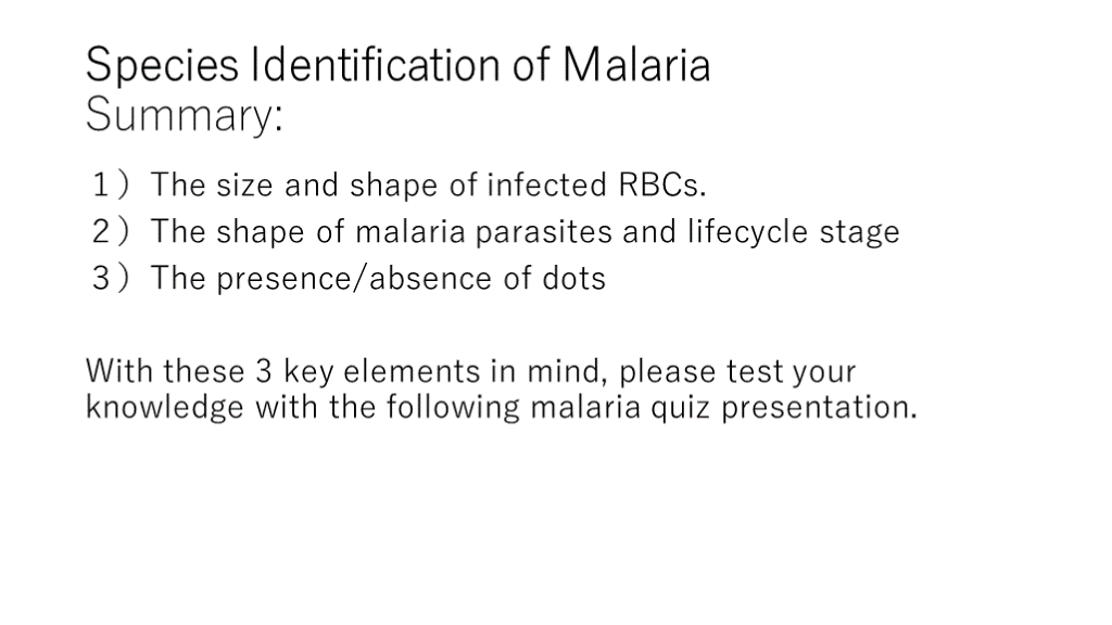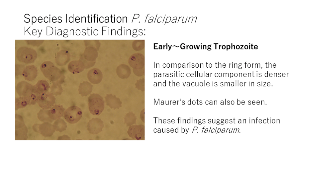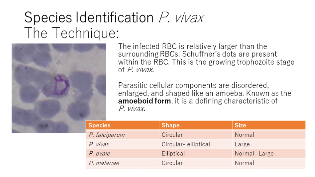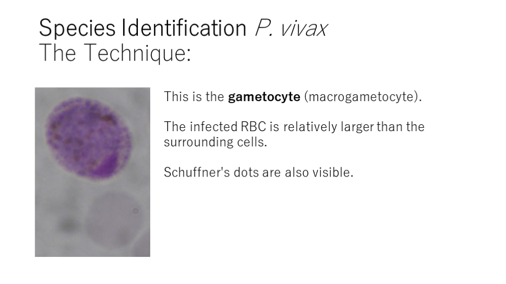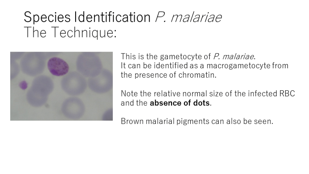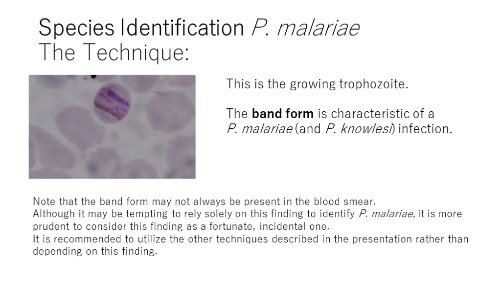 It is recommended to utilize the other techniques described in the presentation rather than depending on this finding. Species Identification P. malariaeThe Technique: