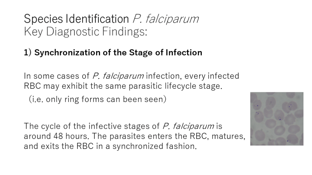 The cycle of the infective stages of P. falciparum is around 48 hours. The parasites enters the RBC, matures, and exits the RBC in a synchronized fashion. Species Identification P. falciparumKey Diagnostic Findings: