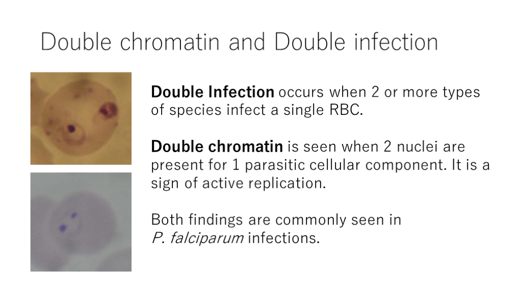 Double chromatin and Double infection Double Infection occurs when 2 or more types of species infect a single RBC.