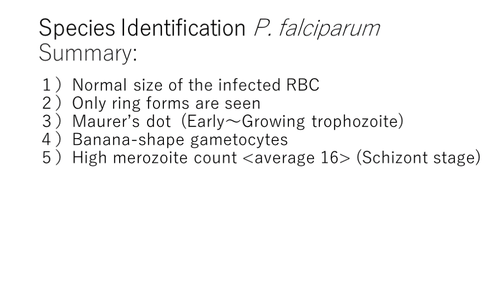 Species Identification P. falciparumSummary: 1)Normal size of the infected RBC2)Only ring forms are seen3)Maurer’s dot (Early~Growing trophozoite)4)Banana-shape gametocytes5)High merozoite count <average 16> (Schizont stage)
