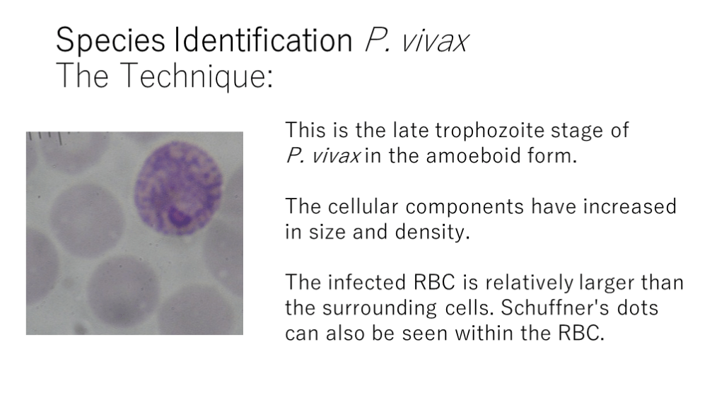 Species Identification P. vivaxThe Technique: The infected RBC is relatively larger than the surrounding RBCs. Schuffner’s dots are present within the RBC. This is the growing trophozoite stage of P. vivax.