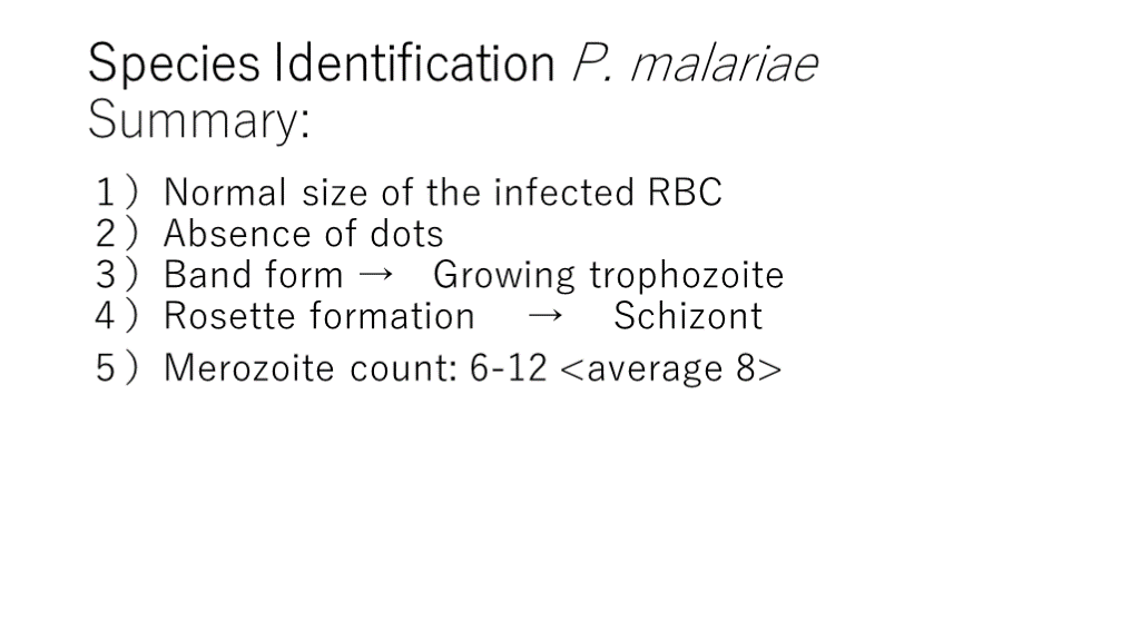 Species Identification P. malariaeSummary: 1)Normal size of the infected RBC2)Absence of dots 3)Band form → Growing trophozoite4)Rosette formation → Schizont