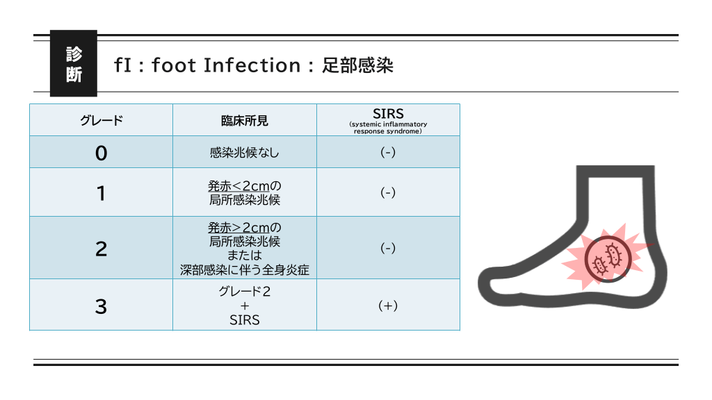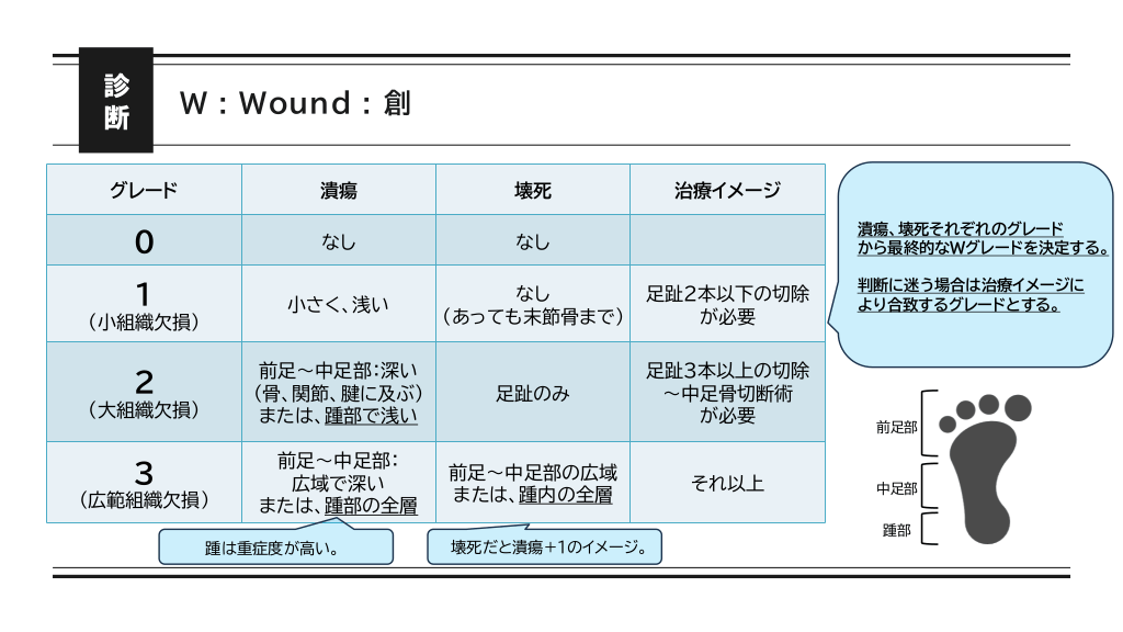 診 断 W : Wound : 創 グレード 潰瘍 0 1 (小組織欠損) 2 (大組織欠損) 3 (広範組織欠損) 壊死 治療イメージ 潰瘍、壊死それぞれのグレード から最終的なWグレードを決定する。 なし なし 小さく、浅い なし (あっても末節骨まで) 足趾2本以下の切除 が必要 前足~中足部:深い (骨、関節、腱に及ぶ) または、踵部で浅い 足趾のみ 足趾3本以上の切除 ~中足骨切断術 が必要 前足~中足部: 広域で深い または、踵部の全層 前足~中足部の広域 または、踵内の全層 それ以上 判断に迷う場合は治療イメージに より合致するグレードとする。 前足部 中足部 踵部 踵は重症度が高い。 壊死だと潰瘍+1のイメージ。 #9.