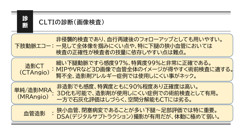 診 断 CLTIの診断(画像検査) 非侵襲的検査であり、血行再建後のフォローアップとしても用いやすい。 下肢動脈エコー : 一見して全体像を掴みにくい点や、特に下腿の狭小血管においては 検査の正確性が検査者の技量に依存しやすい点は難点。 細い下腿動脈ですら感度97%、特異度99%と非常に正確である。 造影CT : MIPやVRなど3D画像で血管全体のイメージが得やすく術前検査に適する。 (CTAngio) 腎不全、造影剤アレルギー症例では使用しにくい事がネック。 非造影でも感度、特異度ともに90%程度あり正確度は高い。 単純/造影MRA : 3D化も可能で、造影剤が使用しにくい症例での術前検査として有用。 (MRAngio) 一方で石灰化評価はしづらく、空間分解能もCTには劣る。 血管造影 狭小血管、閉塞病変であることが多い下腿~足部評価では特に重要。 : DSA(デジタルサブトラクション)撮影が有用だが、体動に極めて弱い。 #12.