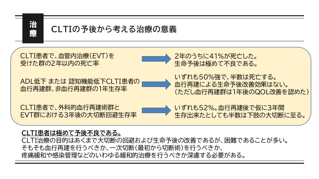 治 療 CLTIの予後から考える治療の意義 CLTI患者で、血管内治療(EVT)を 受けた群の2年以内の死亡率 2年のうちに41%が死亡した。 生命予後は極めて不良である。 ADL低下 または 認知機能低下CLTI患者の 血行再建群、非血行再建群の1年生存率 いずれも50%強で、半数は死亡する。 血行再建による生命予後改善効果はない。 (ただし血行再建群は1年後のQOL改善を認めた) CLTI患者で、外科的血行再建術群と EVT群における3年後の大切断回避生存率 いずれも52%。血行再建後で仮に3年間 生存出来たとしても半数は下肢の大切断に至る。 CLTI患者は極めて予後不良である。 CLTI治療の目的はあくまで大切断の回避および生命予後の改善であるが、困難であることが多い。 そもそも血行再建を行うべきか、一次切断(最初から切断術)を行うべきか、 疼痛緩和や感染管理などのいわゆる緩和的治療を行うべきか深慮する必要がある。 #13.
