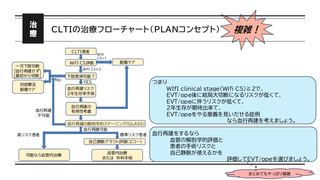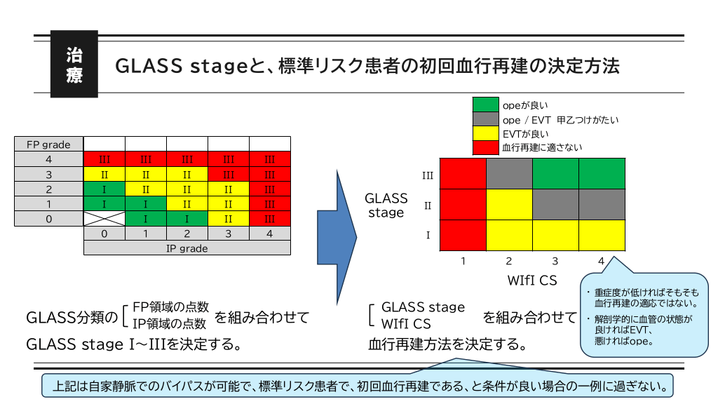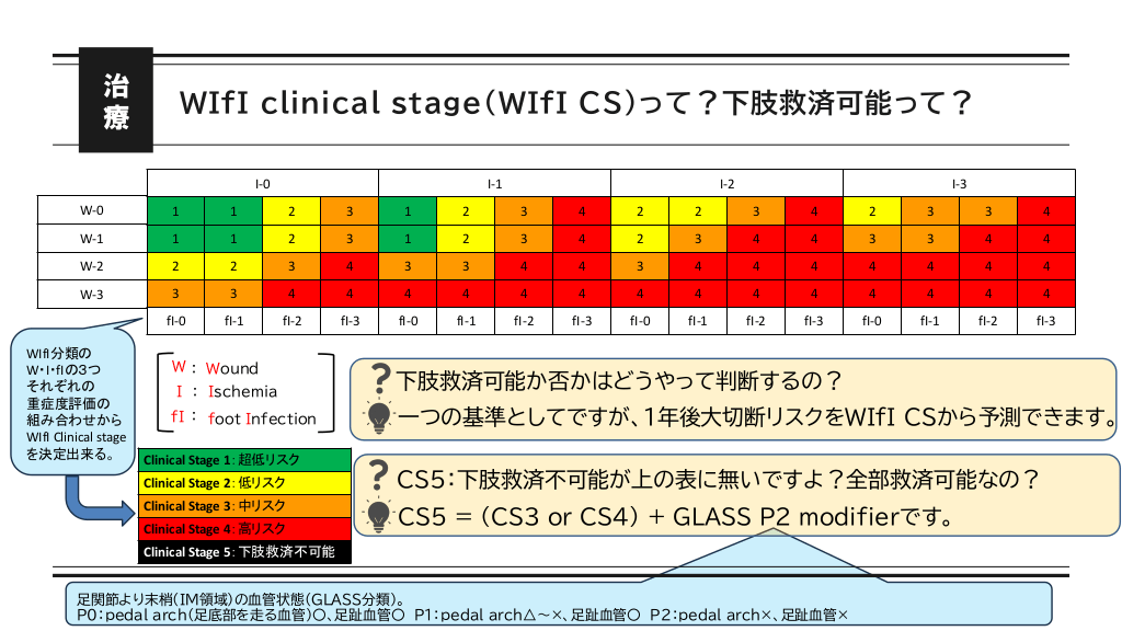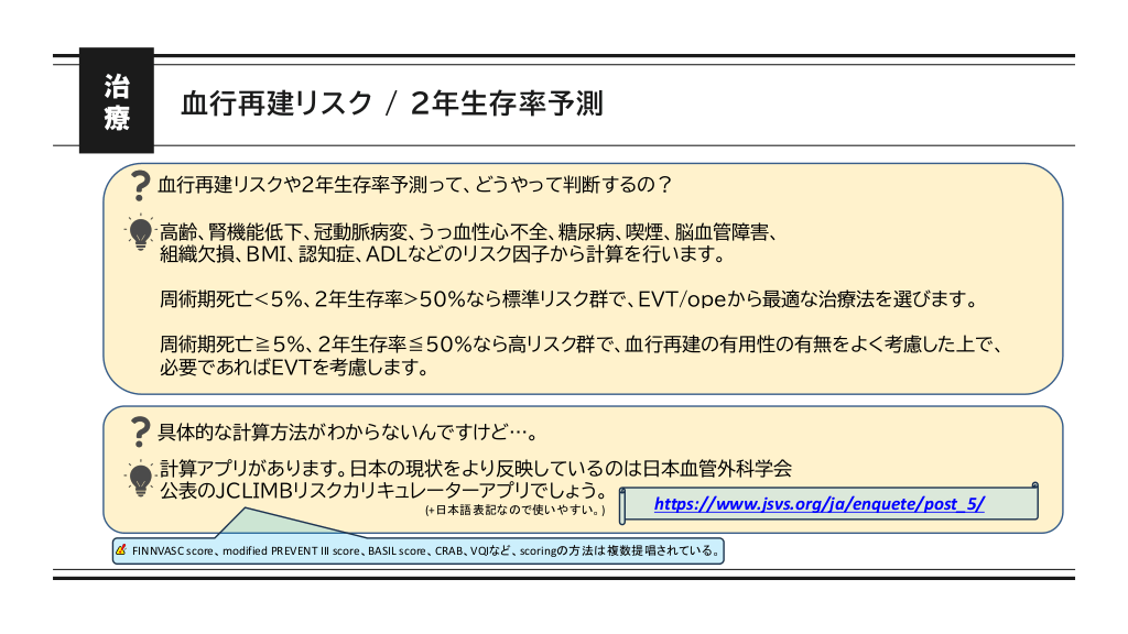 治 療 WIfI clinical stage(WIfI CS)って?下肢救済可能って? I-0 I-1 I-2 I-3 W-0 1 1 2 3 1 2 3 4 2 2 3 4 2 3 3 4 W-1 1 1 2 3 1 2 3 4 2 3 4 4 3 3 4 4 W-2 2 2 3 4 3 3 4 4 3 4 4 4 4 4 4 4 W-3 3 3 4 4 4 4 4 4 4 4 4 4 4 4 4 4 fI-0 fI-1 fI-2 fI-3 fI-0 fI-1 fI-2 fI-3 fI-0 fI-1 fI-2 fI-3 fI-0 fI-1 fI-2 fI-3 WIfI分類の W・I・fIの3つ それぞれの 重症度評価の 組み合わせから WIfI Clinical stage を決定出来る。 W : Wound I : Ischemia fI : foot Infection 下肢救済可能か否かはどうやって判断するの? 一つの基準としてですが、1年後大切断リスクをWIfI CSから予測できます。 Clinical Stage 1:超低リスク Clinical Stage 2:低リスク Clinical Stage 3:中リスク Clinical Stage 4:高リスク CS5:下肢救済不可能が上の表に無いですよ?全部救済可能なの? CS5 = (CS3 or CS4) + GLASS P2 modifierです。 Clinical Stage 5:下肢救済不可能 足関節より末梢(IM領域)の血管状態(GLASS分類)。 P0:pedal arch(足底部を走る血管)〇、足趾血管〇 P1:pedal arch△~×、足趾血管〇 P2:pedal arch×、足趾血管× #15. 治 療 血行再建リスク / 2年生存率予測 血行再建リスクや2年生存率予測って、どうやって判断するの? 高齢、腎機能低下、冠動脈病変、うっ血性心不全、糖尿病、喫煙、脳血管障害、 組織欠損、BMI、認知症、ADLなどのリスク因子から計算を行います。 周術期死亡<5%、2年生存率>50%なら標準リスク群で、EVT/opeから最適な治療法を選びます。 周術期死亡≧5%、2年生存率≦50%なら高リスク群で、血行再建の有用性の有無をよく考慮した上で、 必要であればEVTを考慮します。 具体的な計算方法がわからないんですけど…。 計算アプリがあります。日本の現状をより反映しているのは日本血管外科学会 公表のJCLIMBリスクカリキュレーターアプリでしょう。 https://www.jsvs.org/ja/enquete/post_5/ (+日本語表記なので使いやすい。) FINNVASC score、modified PREVENT III score、BASIL score、CRAB、VQIなど、scoringの方法は複数提唱されている。 #16.
