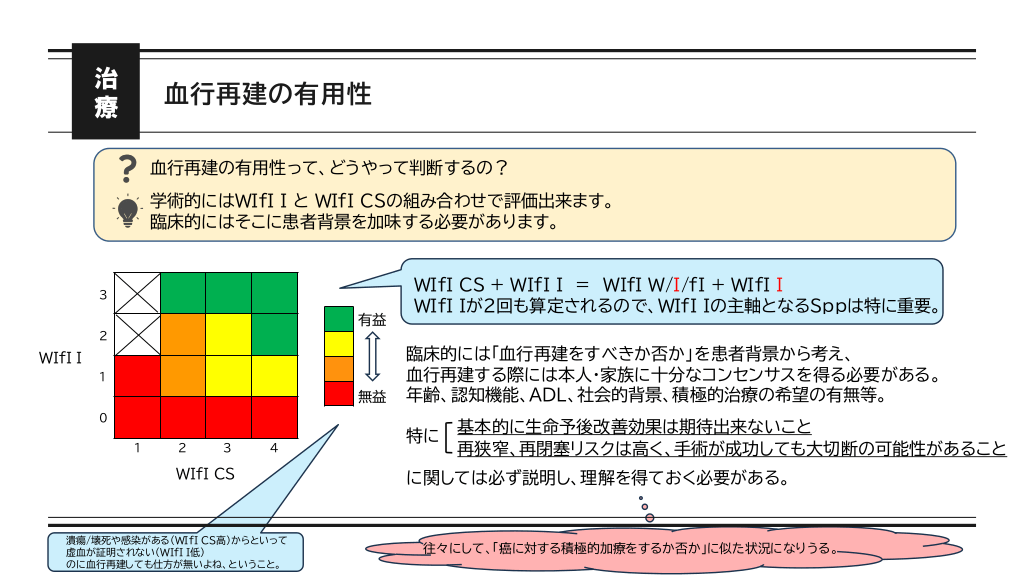 治 療 血行再建の有用性 血行再建の有用性って、どうやって判断するの? 学術的にはWIfI I と WIfI CSの組み合わせで評価出来ます。 臨床的にはそこに患者背景を加味する必要があります。 3 有益 WIfI CS + WIfI I = WIfI W/I/fI + WIfI I WIfI Iが2回も算定されるので、WIfI Iの主軸となるSppは特に重要。 2 WIfI I 1 無益 臨床的には「血行再建をすべきか否か」を患者背景から考え、 血行再建する際には本人・家族に十分なコンセンサスを得る必要がある。 年齢、認知機能、ADL、社会的背景、積極的治療の希望の有無等。 0 1 2 3 4 WIfI CS 潰瘍/壊死や感染がある(WIfI CS高)からといって 虚血が証明されない(WIfI I低) のに血行再建しても仕方が無いよね、ということ。 特に 基本的に生命予後改善効果は期待出来ないこと 再狭窄、再閉塞リスクは高く、手術が成功しても大切断の可能性があること に関しては必ず説明し、理解を得ておく必要がある。 往々にして、「癌に対する積極的加療をするか否か」に似た状況になりうる。 血行再建のリスク評価と選択基準 #17.