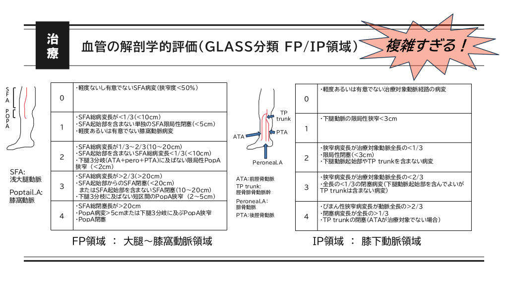 治 療 血管の解剖学的評価(GLASS分類 FP/IP領域) ・軽度ないし有意でないSFA病変(狭窄度<50%) S F A ・軽度あるいは有意でない治療対象動脈経路の病変 0 P O P A 1 0 TP trunk ・SFA総病変長が<1/3(<10cm) ・SFA起始部を含まない単独のSFA限局性閉塞(<5cm) ・軽度あるいは有意でない膝窩動脈病変 PTA ATA 2 ・SFA総病変長が1/3~2/3(10~20cm) ・SFA起始部を含まないSFA総病変長<1/3(<10cm) ・下腿3分岐(ATA+pero+PTA)に及ばない限局性PopA 狭窄 (<2cm) 3 ・SFA総病変長が>2/3(>20cm) ・SFA起始部からのSFA閉塞(<20cm) またはSFA起始部を含まないSFA閉塞(10~20cm) ・下腿3分枝に及ばない短区間のPopA狭窄 (2~5cm) SFA: 浅大腿動脈 Poptail.A: 膝窩動脈 4 複雑すぎる! ・SFA総閉塞長が>20cm ・PopA病変>5cmまたは下腿3分岐に及ぶPopA狭窄 ・PopA閉塞 FP領域 : 大腿~膝窩動脈領域 Peroneal.A ATA:前脛骨動脈 TP trunk: 脛骨腓骨動脈幹 ・下腿動脈の限局性狭窄<3cm 1 2 3 Peroneal.A: 腓骨動脈 PTA:後脛骨動脈 4 ・狭窄病変長が治療対象動脈全長の<1/3 ・限局性閉塞(<3cm) ・下腿動脈起始部やTP trunkを含まない病変 ・狭窄病変長が治療対象動脈全長の<2/3 ・全長の<1/3の閉塞病変(下腿動脈起始部を含んでよいが TP trunkは含まない病変) ・びまん性狭窄病変長が動脈全長の>2/3 ・閉塞病変長が全長の>1/3 ・TP trunkの閉塞(ATAが治療対象でない場合) IP領域 : 膝下動脈領域 #18.
